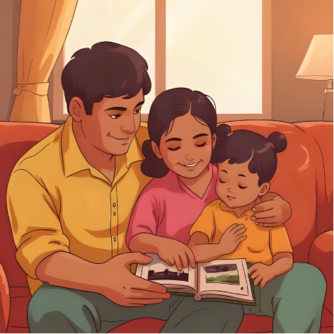 A heartwarming moment as an Indian family reminisces old memories together, flipping through a cherished photo album filled with love and laughter.