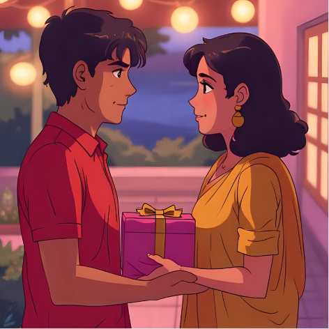 A sweet surprise! An Indian boyfriend makes his girlfriend's day extra special with a heartfelt gift and a smile full of love.