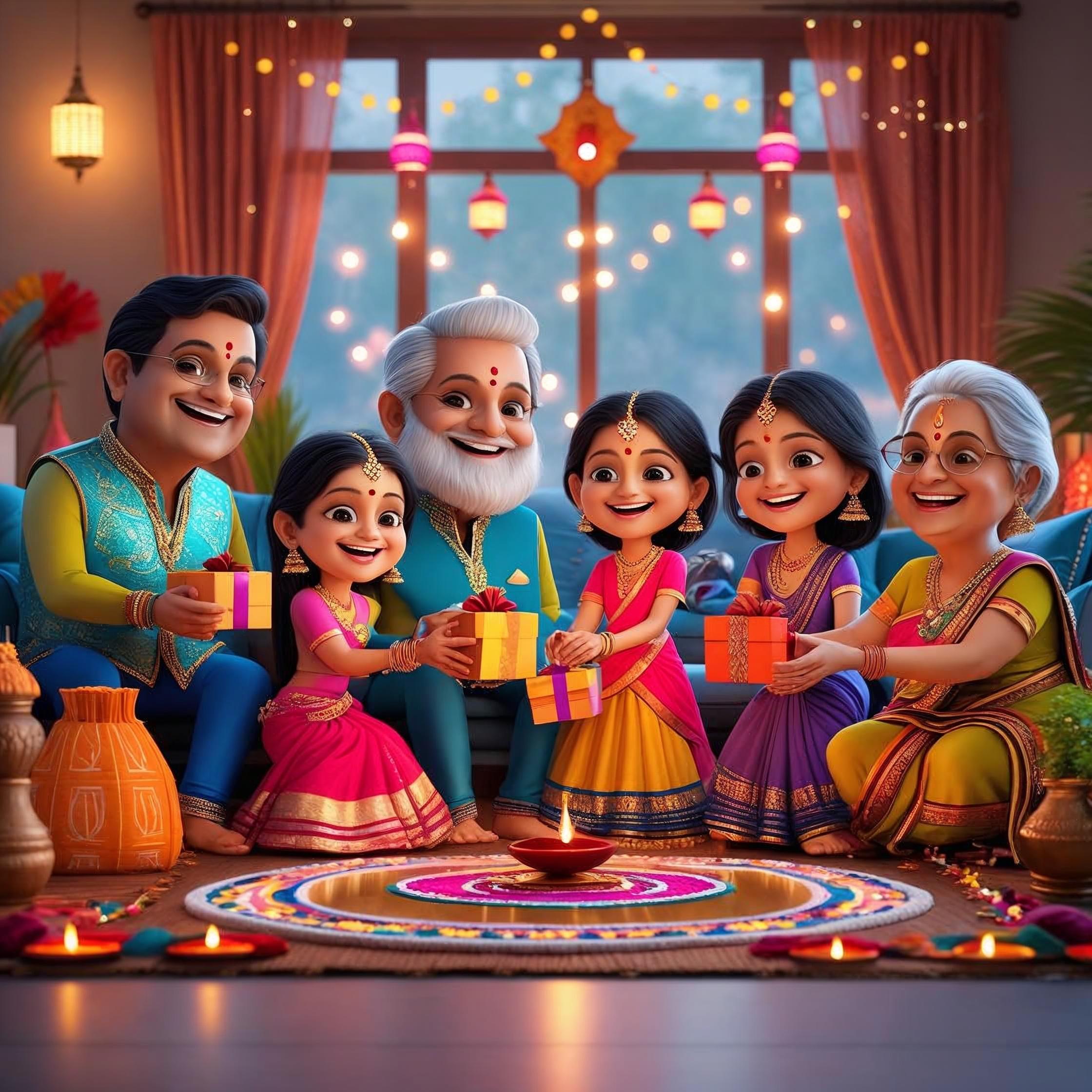 Festive joy all around! An Indian family comes together to exchange gifts, share smiles, and celebrate the beauty of tradition during a vibrant festival.